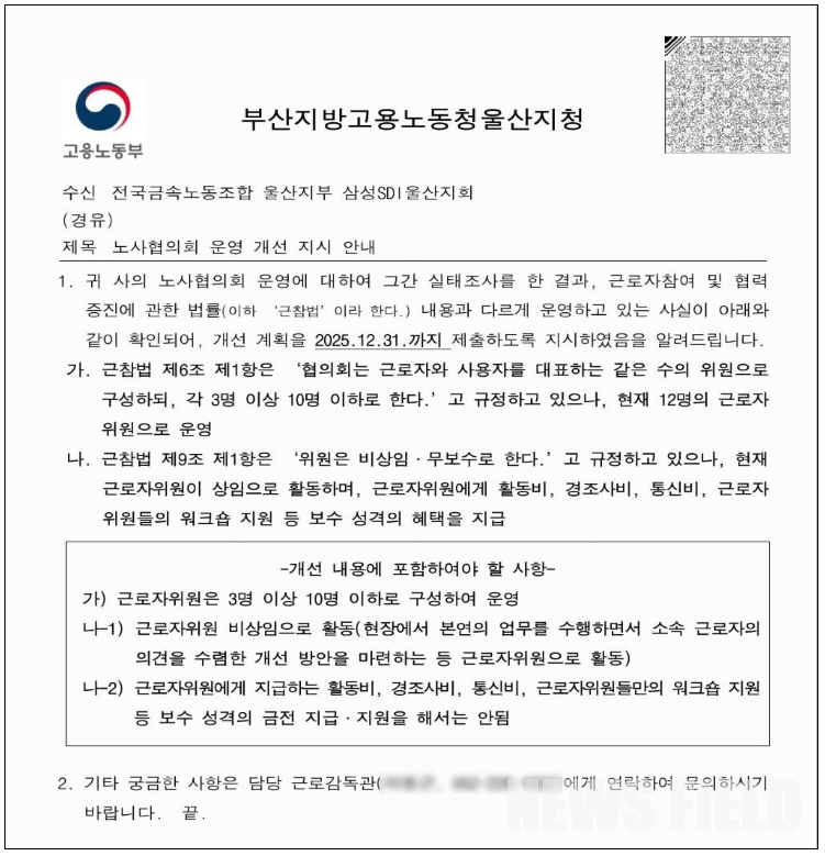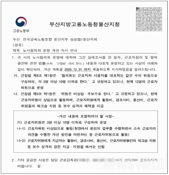 삼성SDI 울산 사업장에서 사측이 노사협의회 근로자위원들에게 금품을 제공해 온 사실이 고용노동부 조사에서 드러났다. 노동당국은 근로자위원 비상임·무보수 원칙을 위반한 것으로 판단하고 회사 측에 개선을 명령했다.