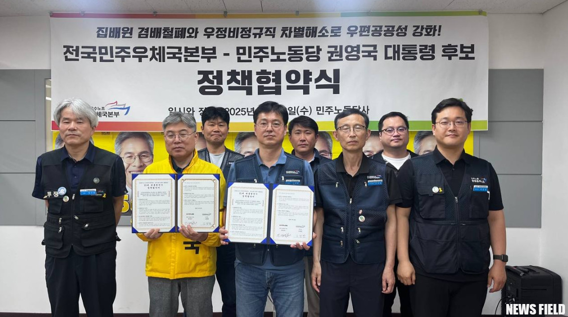 전국민주우체국본부가 민주노동당 권영국 대선 후보와 정책 협약을 맺고, 더불어민주당에 정책 요구안을 전달하며 우정사업 종사자들의 처우 개선을 위한 목소리를 높였다.