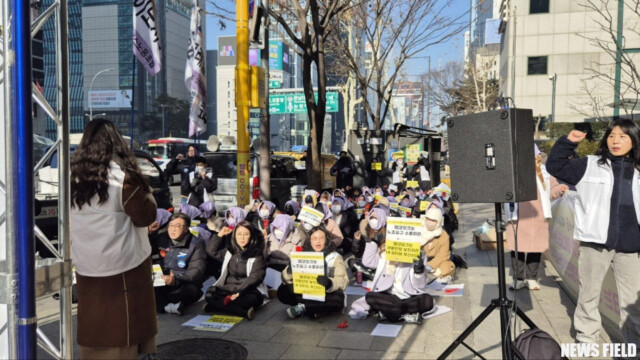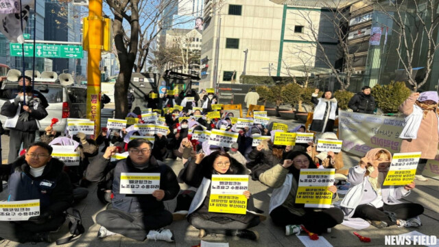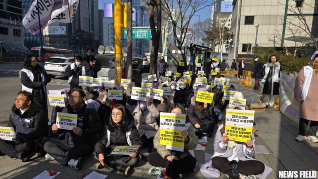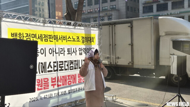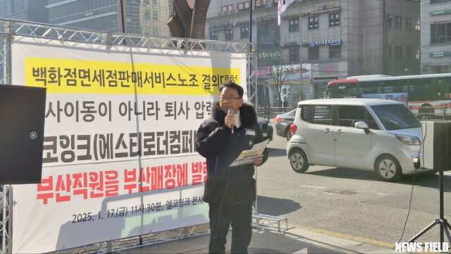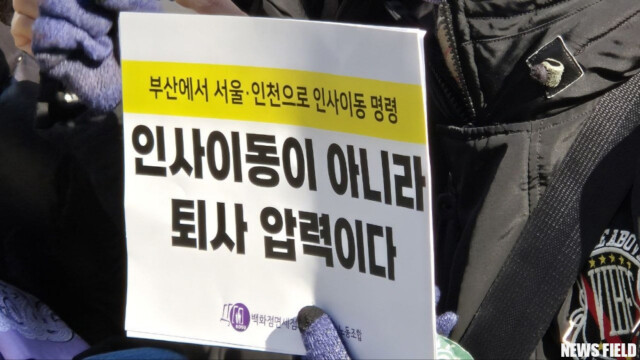 17일, 백화점면세점판매서비스노동조합은 “인사이동이 아니라 퇴사압력이다! 엘코잉크는 부산 직원을 부산매장에 발령하라!”는 구호 아래 엘코잉크 본사 앞에서 결의대회를 열었다.