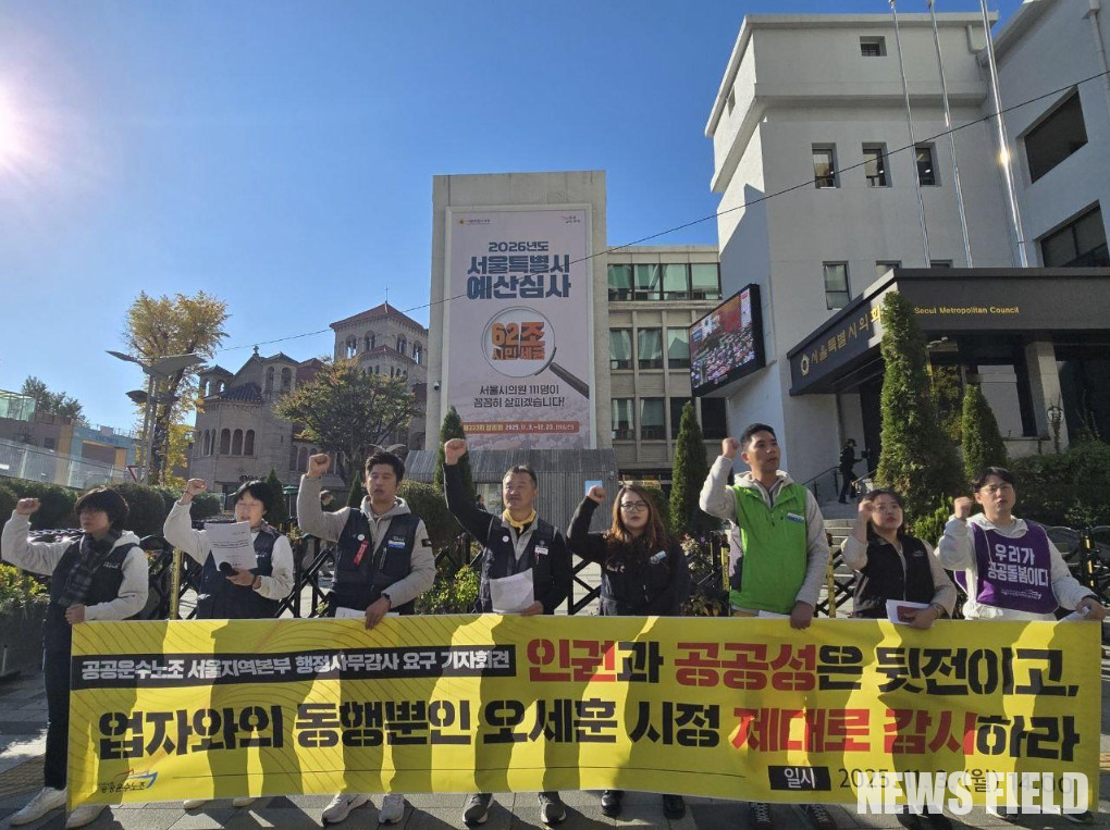 본부는 3일 오후 2시, 서울시의회 본관 앞에서 “인권과 공공성은 뒷전이고, 업자와의 동행뿐인 오세훈 시정 제대로 감시하라!”는 제목의 기자회견을 개최했다. 본부는 11월 4일부터 시작되는 2025년 서울시 행정사무감사에 앞서, 오세훈 시정 하에서 파괴된 공공성과 후퇴한 노동자의 인권을 지적하며 서울시의회의 철저한 감시와 책임을 묻는 감사를 요구했다.