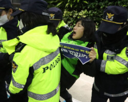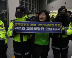 12월 2일 교육부 세종청사 로비, 정인용 공공운수노조 교육공무직본부장이 전국학교비정규직연대회의 대표자들과 연좌 농성 중 경찰에 의해 무력으로 진압, 강제 폭력 연행되는 모습이다.