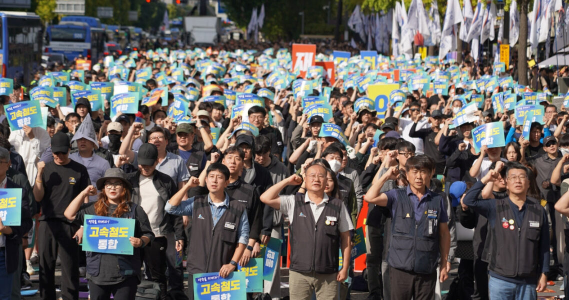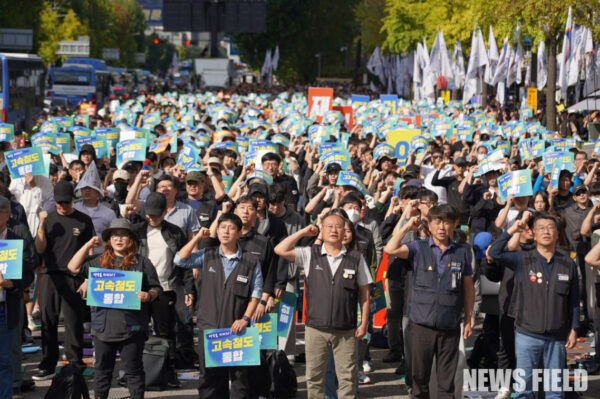 전국철도노동조합(이하 철도노조)은 16일 오후 2시, 서울 용산 대통령실 앞에서 4천여 명의 조합원이 모인 가운데 ‘철도노동자 총력결의대회’를 열고, ▲고속철도(KTX·SRT) 기관 통합 ▲성과급 지급기준 정상화 ▲산재 없는 철도 현장 ▲2025년 임금단체협약 승리를 주요 요구로 내세우며 전면 투쟁을 선포했다.