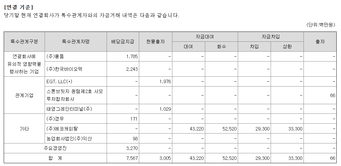 같은 해 올품은 김 상무에 대한 배당과 별도로, 관계기업인 하림지주로부터 30억 1,982만 9천 원, 제일사료로부터 12억 1,695만 7천 원의 배당금을 수취했다. 아울러 스톤브릿지 퀀텀 2호 사모투자 합자회사 등 일부 투자처에도 출자를 단행하는 등, 계열사와 자회사 간 자금 이동이 활발히 이뤄진 것으로 나타났다.