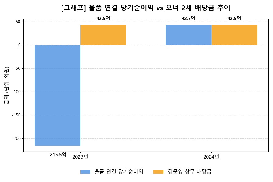 2024년에는 연결 당기순이익이 42억 7,340만 원으로 가까스로 흑자 전환에 성공했음에도, 올품은 당기순이익의 99.3%에 해당하는 42억 4,500만 원을 다시 김 상무에게 배당했다.