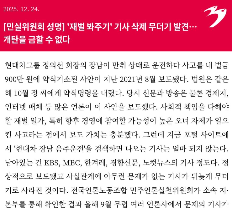 전국언론노동조합 민주언론실천위원회(민실위)는 이번 사태를 “재벌 봐주기 기사 삭제”로 규정하며, 광고주인 대기업의 민원을 이유로 언론이 원칙을 훼손한 중대한 편집권 침해 사례라고 밝혔다. 민실위는 삭제·수정된 기사의 원상 복구를 모든 언론사에 촉구하고, 현대차그룹에는 언론에 대한 직·간접적 압박 중단과 사회적 책임 이행을 요구했다.