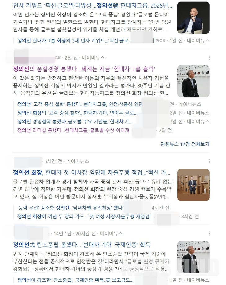 실제로 24일 오후, ‘현대차그룹, 이웃돕기 성금 350억 쾌척’과 ‘정의선 회장, 글로벌 자동차 리더 선정’ 등의 보도자료가 약 1시간 간격으로 배포됐다. 이 기사들은 수십 개 언론사를 통해 재생산되며 포털 뉴스 페이지의 상단을 순식간에 점령했다.
