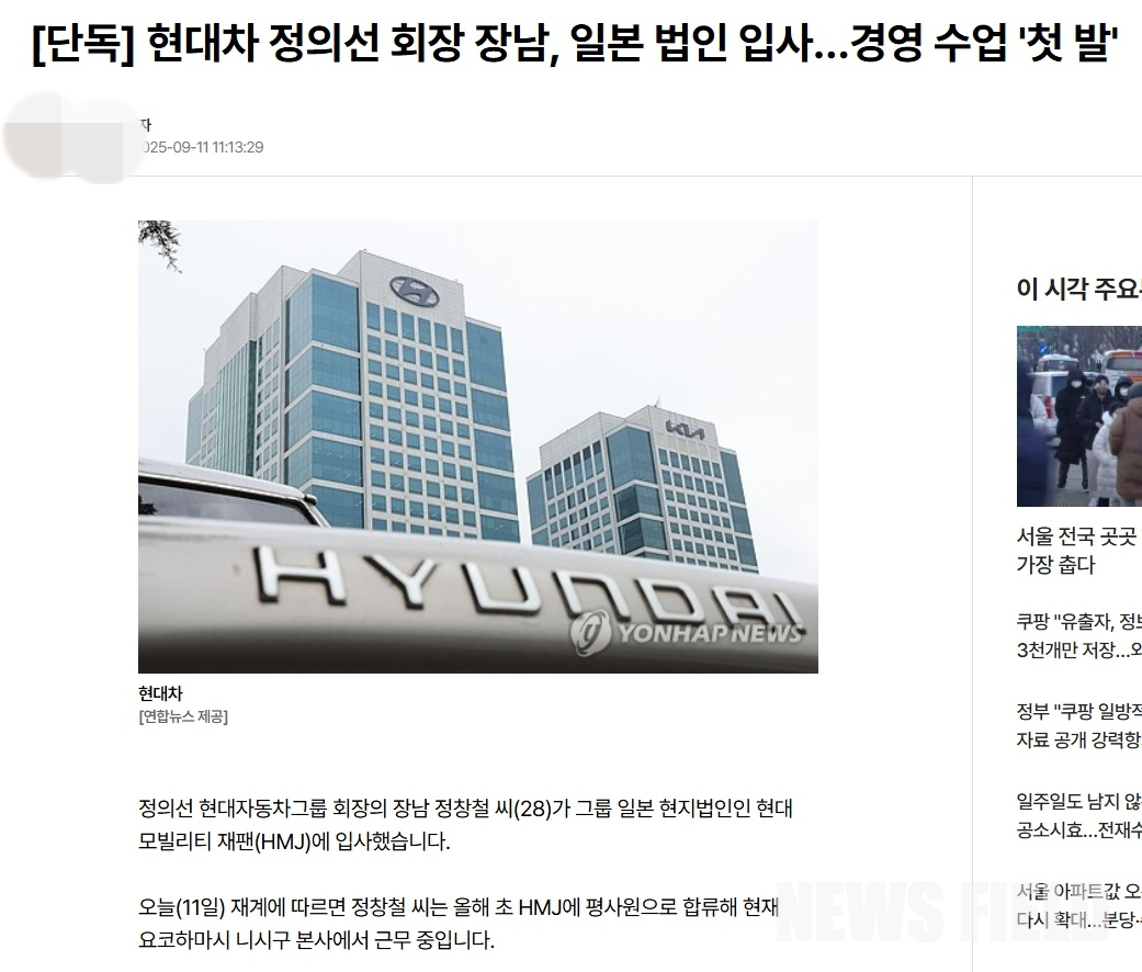 26일 업계에 따르면, 지난 9월 11일 C사 계열 방송사는 “[단독] 현대차 정의선 회장 장남, 일본 법인 입사…경영 수업 ‘첫 발’”이라는 제목의 리포트를 통해 정 씨가 현대자동차그룹 일본 법인인 현대 모빌리티 재팬(HMJ)에 입사했음을 보도했다. 이는 정 씨의 경영 참여를 공식화한 사실상의 ‘4세 경영 데뷔’ 선언으로 받아들여졌다.
