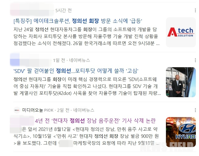 이로 인해 네이버 모바일 뉴스 검색창에서 ‘정의선’을 입력했을 때, 상위에 노출되던 ‘장남 음주운전’ 및 ‘기사 삭제 논란’ 관련 뉴스는 2~3페이지 뒤로 밀려나거나 쏟아진 홍보성 기사 사이에 파묻혀 가시성이 현저히 떨어지는 결과가 초래됐다.
