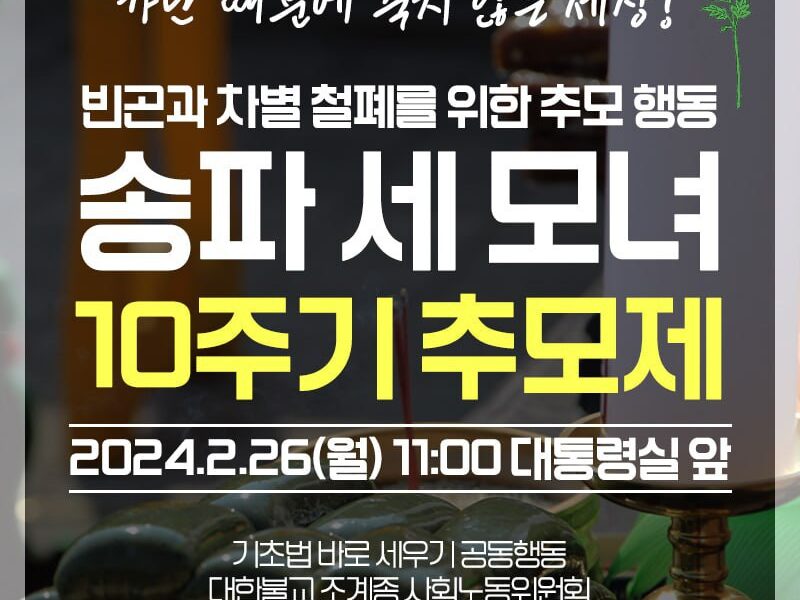 기초생활보장법바로세우기공동행동, 대한불교조계종사회노동위원회, 장애인과가난한이들의3대적폐폐지공동행동은 송파 세 모녀와 가난과 차별로 인해 세상을 떠난 이들을 추모하고, 반복되는 죽음을 멈추기 위한 제도 개선을 요구하기 위해 다음과 같이 ‘송파 세 모녀 10주기 추모 행사’를 진행한다.