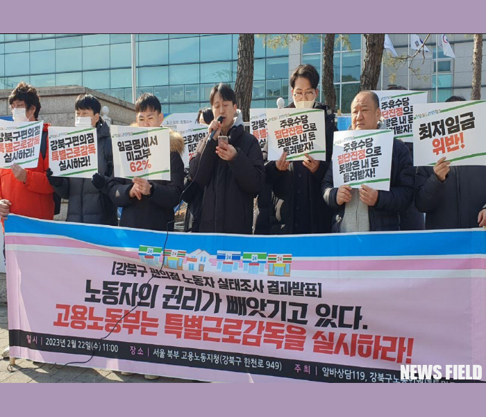 그러면서 “고용노동부는 지금 당장 특별근로감독을 실시해야 한다. 강북구 편의점에 대한 전수조사를 통해 노동법 위반 사업장을 처벌하고 편의점 노동자의 빼앗긴 권리를 지켜야 한다. 우리는 편의점 노동자의 권리가 존중받는 강북구를 만들기 위해 끊임없이 감시하고 연대할 것이다”고 밝혔다.