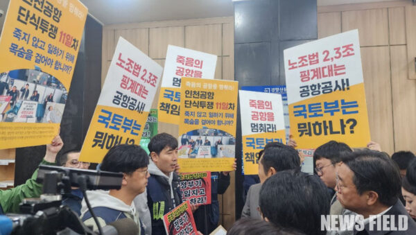 공공운수노조와 전국공항노조 등으로 구성된 전국공항노동자연대가 더불어민주당 정책간담회 직전 정청래 대표를 만나 공항 파업 장기화의 원인과 정부·공기업의 책임 회피 문제를 직접 전달했다. 이에 정 대표는 노동자들의 촉구에 “살펴보겠다”는 원론적인 입장을 밝히고 자리를 떴다.