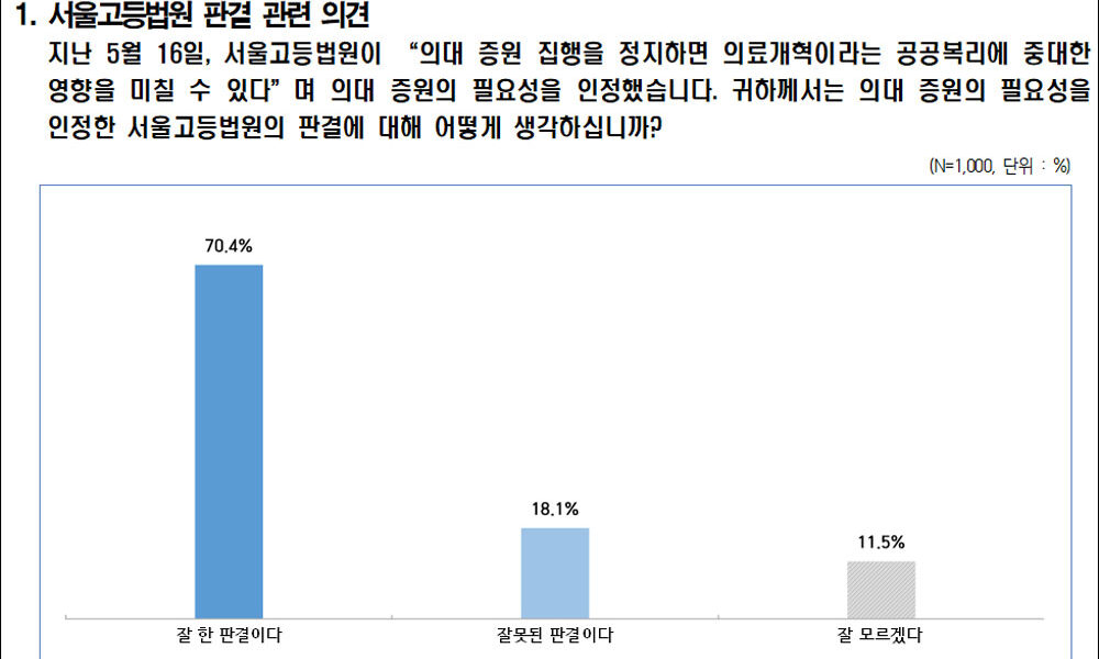 조사 결과에 따르면 의대 증원과 관련한 서울고등법원의 판결에 대한 지지율은 70.4%로 나타났다. 법원은 지난 5월 16일 의대 증원이 의료
