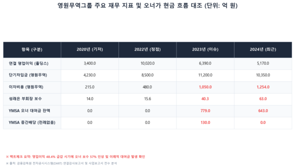 8일 본지가 영원무역홀딩스, 영원무역, 와이엠에스에이(YMSA), 영원아웃도어 등 핵심 4개 사의 2020년부터 2024년까지의 사업·감사보고서를 분석한 결과, ▲ 코로나19 팬데믹 시기인 2020년 실적을 비교 기준으로 한 보수 산정 ▲ 계열사 차입금 및 금융비용 증가 ▲ 비상장사를 통한 자금 대여 등 성래은 부회장의 승계 자금 확보와 연관된 것으로 해석될 수 있는 자금 흐름이 포착됐다.
