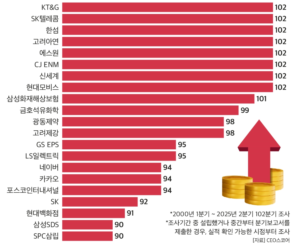 3일 기업데이터연구소 CEO스코어가 국내 500대 기업의 분기별 실적을 분석한 결과, KT&G, SK텔레콤, 한섬, 고려아연, 에스원, CJ ENM, 신세계, 현대모비스가 2000년 1분기부터 2025년 2분기까지 단 한 차례의 적자도 없이 흑자를 유지했다.