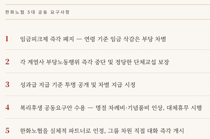 한화그룹 노동조합협의회는 임금피크제의 즉각적인 폐지를 비롯해 부당노동행위 중단과 단체교섭 보장, 성과급 지급 기준의 투명한 공개와 차별 시정, 복리후생 공동요구안 수용, 그룹 차원의 직접 대화 개시를 핵심으로 한 5대 공동 요구사항을 제시하고 있다. 그래픽=뉴스필드.