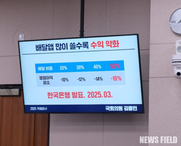 이어 김 의원이 공개한 한국은행의 발표 자료(2025년 3월)를 근거로 배달앱을 많이 사용할수록 자영업자의 수익이 더욱 줄어드는 악순환이 확대되고 있음을 확인했다고 밝혔다.