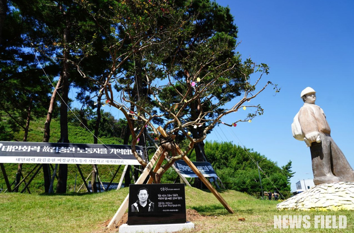 태안화력발전소에는 2018년 사고로 사망한 김용균 노동자의 추모 조형물이 이미 자리하고 있었다. 이번 김충현 노동자의 추모비가 나란히 세워지면서, ‘위험의 외주화’로 인한 비극이 여전히 반복되고 있음을 보여주었다.