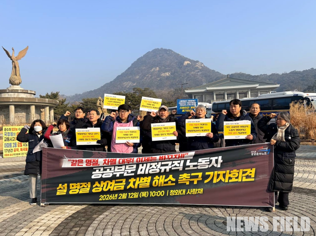 (뉴스필드) 김가은 기자 = 이재명 정부가 2026년부터 공공부문 비정규직 노동자들의 명절 상여금을 ‘기본급의 120%’로 인상하기로 확정했음에도 불구하고, 실제 현장에서는 예산 부족과 지침 해석의 한계를 이유로 이행이 거부되거나 오히려 처우가 악화되는 사례가 잇따르고 있다. 이에 공공운수노조는 12일 오전 10시, 서울 종로구 청와대 사랑채 앞에서 기자회견을 열고 정부 지침의 철저한 이행과 차별 해소를 강력히 촉구했다.