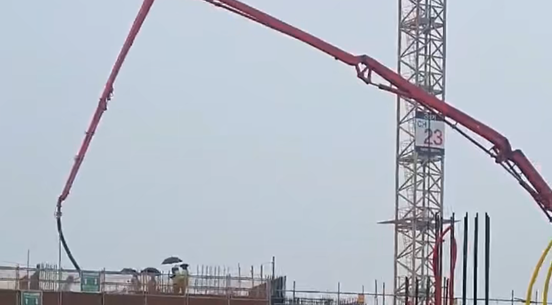 영상 속 작업자는 폭우가 내리는 와중에 붐대 아래 연결된 호스(자바라)를 잡고 콘크리트를 쏟아 붓고 있었고, 주변에는 시공 관계자들이 우산을 쓰고 이를 지켜보고 있다.