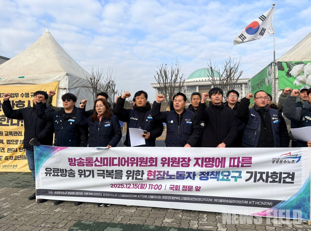 유료방송 위기 극복을 위한 현장 노동자들의 정책 요구 기자회견이 김종철 방미통위 위원장 지명자 인사청문회를 하루 앞둔 15일 오전 11시, 국회 정문 앞 인도에서 개최됐다. 공공운수노조 방송통신협의회, 언론개혁시민연대 등 다수의 현장 노동자 및 시민단체가 참여했다. 이들은 과거 과학기술정보통신부의 대기업·IPTV 중심 편향 정책으로 심화된 케이블방송의 산업적 위기 해결을 촉구하며 정책 제안을 제시했다.