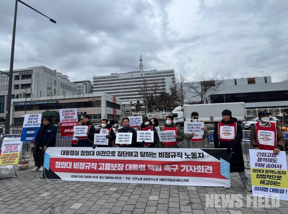 23일 오전 용산 대통령실 앞에서 서울지역공공서비스지부 조합원들이 청와대 비정규직 노동자의 고용 보장과 이재명 대통령의 책임 있는 해결을 촉구하는 피켓을 들고 기자회견을 진행하고 있다.