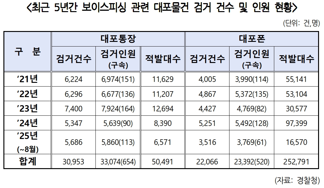 13일 더불어민주당 한병도 의원(전북 익산시을, 국회 행정안전위원회)이 경찰청으로부터 제출받은 자료에 따르면, 최근 5년간 보이스피싱 사기에 악용된 대포통장·대포폰 등 명의도용 물품은 총 30만 3,282건에 달했다. 같은 기간 검거인원은 총 5만 6,466명이었으며, 이 중 1,174명은 구속됐다.