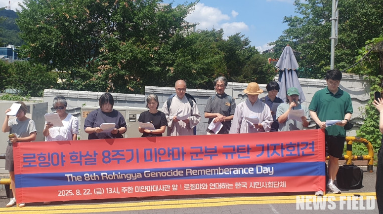미얀마 군부의 로힝야족 학살 8주기를 맞아 한국 시민사회 단체들이 정의로운 해결을 촉구하며 목소리를 높였다. 20여 개 시민사회단체는 22일 서울 용산구 주한 미얀마 대사관 앞에서 기자회견을 열고 미얀마 군부의 폭력 중단을 촉구하고 한국 정부와 국제사회의 적극적 행동을 요구했다. 이들은 로힝야족이 겪는 참혹한 현실을 고발하며 책임 있는 자세를 강조했다.