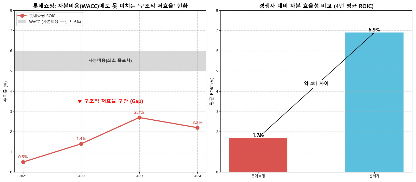 문제는 이 수치가 롯데쇼핑의 가중평균자본비용(WACC)인 5~6%를 크게 밑돈다는 점이다. WACC는 기업이 자본을 조달하기 위해 주주와 채권자에게 지불해야 하는 최소한의 비용(이자+배당)이다. 즉, 롯데쇼핑은 5~6%의 비용을 들여 자금을 운용하고 있지만, 실제 수익률은 그 절반에도 못 미치는 1~2%대에 머물고 있다는 의미다. 경제학적으로 이는 기업이 영업을 할수록 주주 가치를 훼손하는 ‘가치 파괴(Value Destruction)’ 상태에 놓여 있음을 뜻한다.