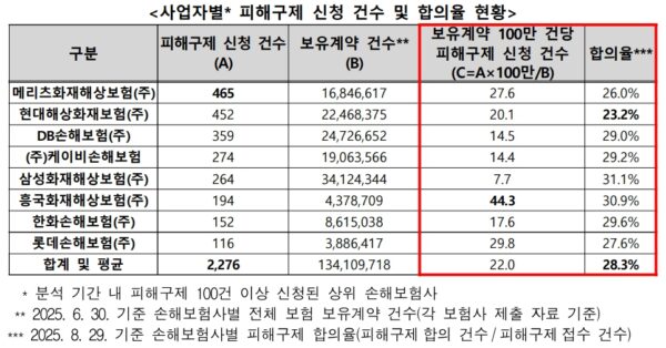 보유계약 100만 건당 피해구제 신청 건수를 보면, 흥국화재해상보험(주)가 44.3건으로 다른 보험사들에 비해 압도적으로 많은 분쟁 비율을 보였으며, 롯데손해보험(주)(29.8건), 메리츠화재해상보험(주)(27.6건)가 그 뒤를 이었다.