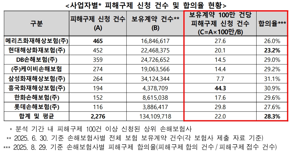 특히, 상위 8개 보험사의 평균 합의율은 28.3%에 그쳤는데 , 삼성화재해상보험(주)가 31.1%로 가장 높았던 반면, 현대해상화재보험(주)는 23.2%로 가장 낮아, 소비자 분쟁 해결에 가장 소극적인 것으로 나타났다. 메리츠화재해상보험(주)의 합의율 역시 26.0%로 평균에 미치지 못했다.