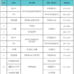 칼슘은 ‘탐사수’ 제품의 함량이 최대 61.0mg로 가장 높았다. ‘석수’가 60.9mg, ‘동원샘물’이 45.4mg로 뒤를 이었다. 칼슘은 부족할 경우 신경, 근육이 둔해져서 장애가 생길 수 있으며, 과다할 경우 심장 수축 문제가 발생할 수 있어 적절한 농도를 유지해 주는 것이 중요하다. 또, 뼈와 치아 형성 유지의 중요한 역할을 하며, 골다공증 발생위험 감소에 도움을 준다.