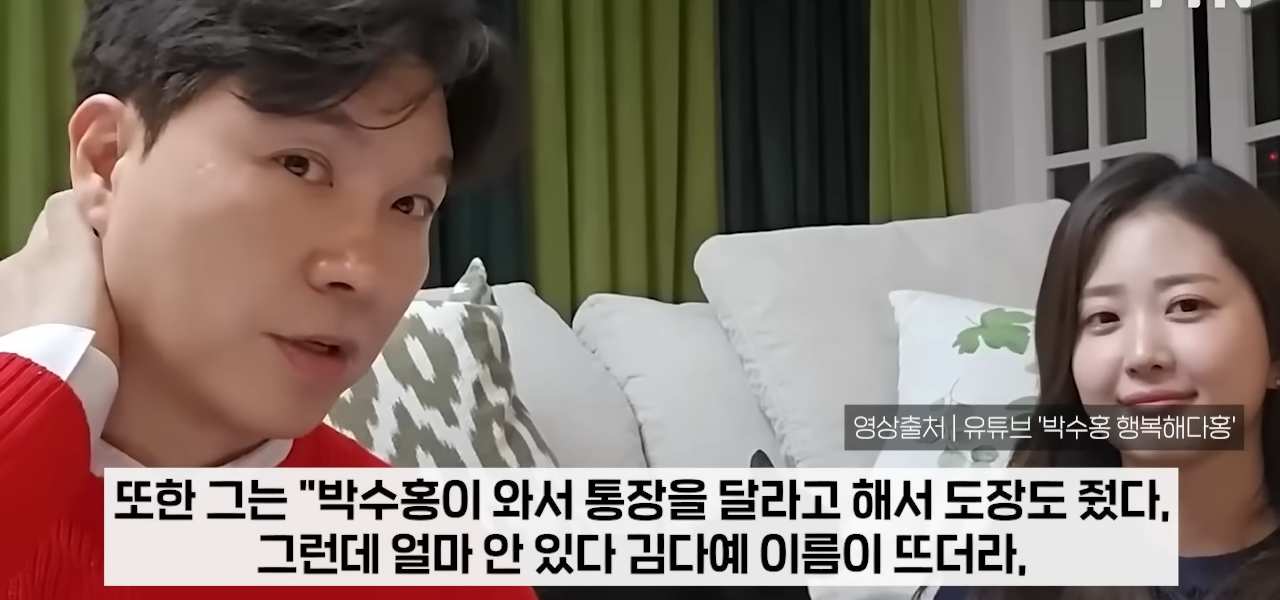 또한 그는 “박수홍이 와서 통장을 달라고 해서 도장도 줬다. 그런데 얼마 안 있다 김다예 이름이 뜨더라. 그 아파트가 지금 20억”이라며 아파트 명의도 빼앗겼다고 분통을 터트렸다.