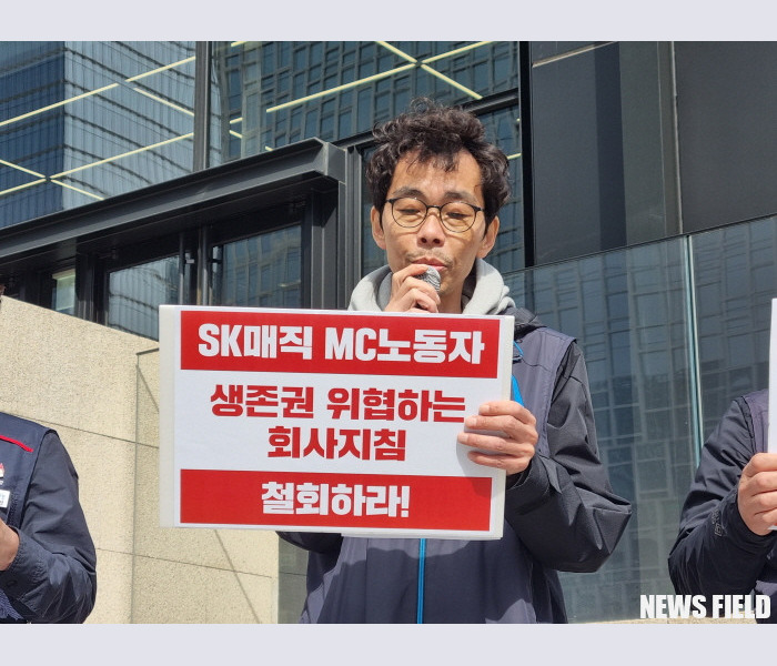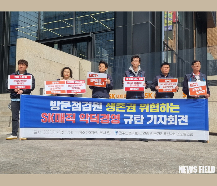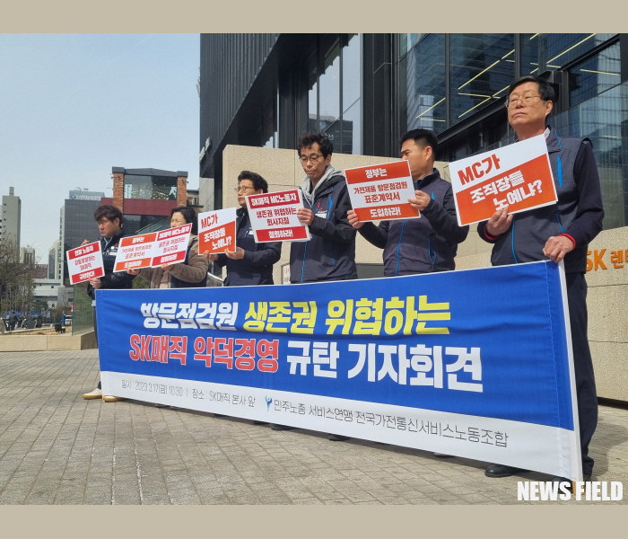 전국가전통신서비스노동조합(가전통신노조) SK매직MC지부는 17일 오전 10시 30분, SK매직(주) 본사(서울특별시 종로구 청계천로 85 삼일빌딩) 앞에서 ‘방문점검원 생존권 위협하는 SK매직 악덕경영 규탄’ 기자회견을 진행했다.