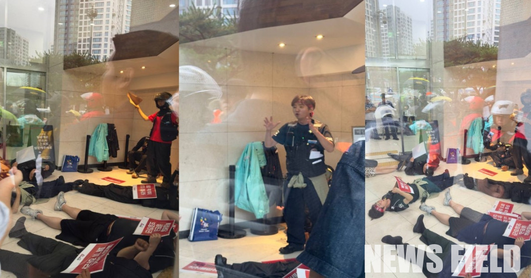 “우리는 멈추지 않는다”는 구호와 함께 이날의 투쟁은 배민 본사 로비 전격 점거로 이어졌다. 라이더들은 “하청 착취 철폐하라!”, “폭염 속 죽음의 미션 중단하라” 등의 구호를 외치며, 로비 한복판에서 ‘다이인 퍼포먼스’를 펼쳤다.