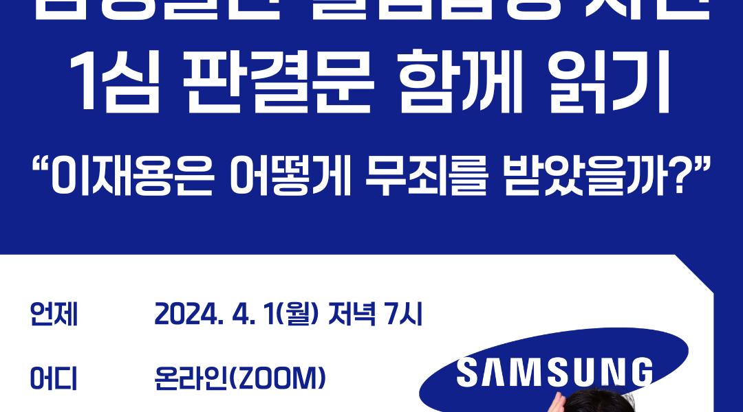이에 참여연대는 오는 4월 1일(월) 저녁 7시, ‘삼성물산 불법합병 사건 1심 판결문 함께 읽기 온라인 설명회’를 개최한다고 25일 밝혔다. 이번 설명회에서는 김종보 참여연대 경제금융센터 소장 변호사가 강연자로 나서, 1심 판결문을 함께 읽어보며 이재용 회장 무죄 판결의 이유와 법적 논리의 문제점을 심층 분석한다.