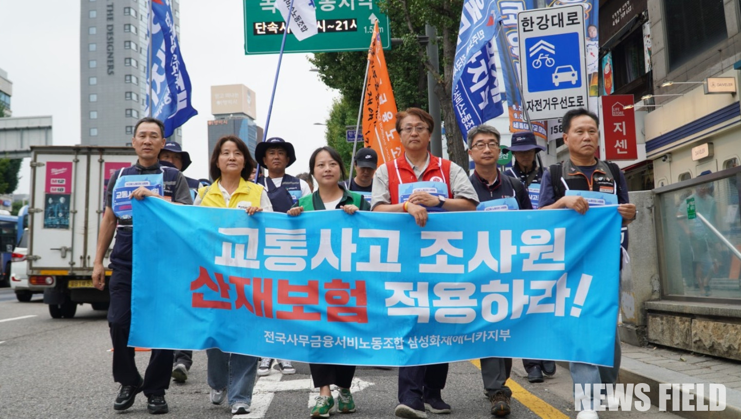 (뉴스필드) 진용준 기자 = 교통사고 조사원들의 열악한 노동 환경과 산재보험 미적용 문제가 지속되면서, 이들의 권리 보장을 요구하는 목소리가 커지고 있다. 전국사무금융서비스노동조합 삼성화재애니카지부는 정부와 보험사의 방관 속에 위험에 노출된 노동자들의 현실을 알리고자 2차 거리 행진에 나섰다.