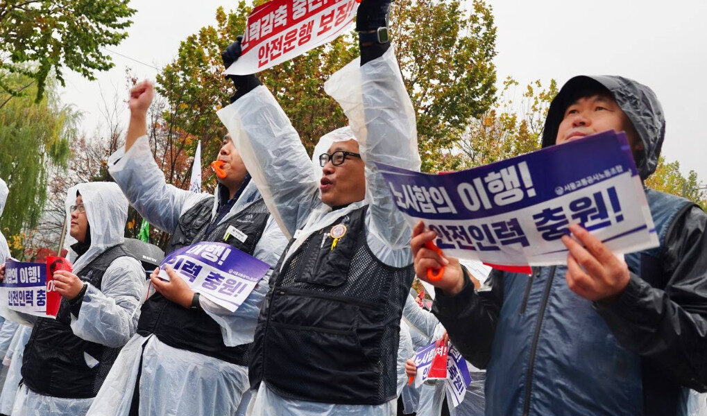 서울교통공사노동조합은 27일 오전 10시 30분 서울시청 앞에서 ‘총력투쟁 결의대회’를 열었다. 이날 결의대회는 비가 오는 가운데서도 머리띠를 두른 조합원들로 가득 찼으며, ‘구조조정 분쇄! 안전인력 충원! 서울시 직접 교섭 촉구!’라는 슬로건을 내세웠다. 노조는 서울시와 공사가 ‘공공기관 혁신가이드’ 및 재정 위기 해결을 명분으로 매해 일방적인 정원 감축과 외주화를 시도하고 있다고 비판했다.