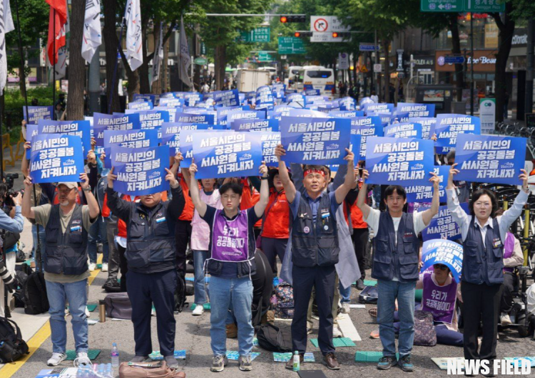 이에 민주노총 공공운수노조와 서울시사회서비스원공대위는 17일 서울시청 동편광장에서 공공운수노조-서사원공대위 공동결의대회를 열고, 서울시민의 공공돌봄과 서사원 사수를 위한 강력한 목소리를 냈다.