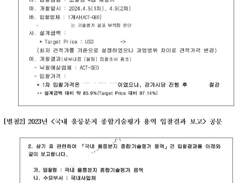 권 의원실이 석유공사로부터 제출받은 <국내 울릉분지 추가 유망성 평가용역 입찰결과 보고>에 따르면, 석유공사는 당초 3개사를 지명했으나, 기술평가 결과 액트지오만 적격으로 평가되었고, 나머지 2개사는 부적격 처리되어 입찰에 참여할 수 없게 되었다.