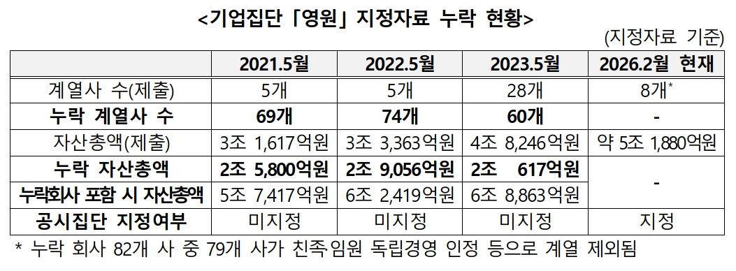 이에 공정거래위원회는 2021년부터 2023년까지 지정 자료를 허위로 제출한 혐의(공정거래법 위반)로 성 회장을 최근 검찰에 고발했다. 누락된 회사는 역대 최다인 82개, 숨겨진 자산만 3조 2천400억 원에 달한다.