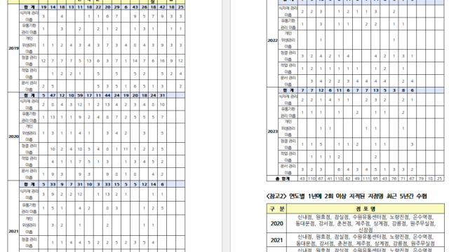 한편, 현재 운영 중인 점포 13곳은 지난 2020년 이후 매년 실시된 검사 3회 중 2회 이상 적발되었다. 점포별 미흡사항 시정 조치 후 수협중앙회에 시정 결과보고서를 제출하게 되었으나, 개선하는 모습을 보이지 않아 점검의 실효성이 없고 요식행위에 불과하다.