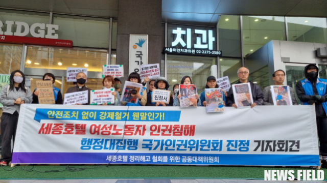 종교, 학술, 법률, 인권, 노동, 정당 등 100여 개 시민사회단체들이 모인 ‘세종호텔 정리해고 철회를 위한 공동대책위원회’는 중구청의 행정대집행으로 인권침해가 발생하고, 남대문경찰서는 이를 방관한 것에 대해 18일 오전 11시, 국가인권위 앞에서 기자회견을 열고 인권위에 진정서를 접수했다.