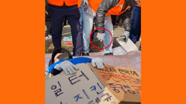 그러나 중구청은 칼과 가위를 들고 여성 해고노동자의 몸 근처에서 빠레트 등을 잘라내고, 누워있던 빠레트를 빼냈다. 이 과정에서 여성노동자의 목이 꺾이고 머리를 부딪혀 상해를 입었다.
