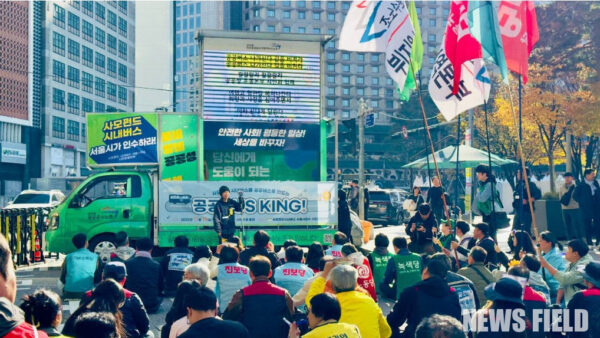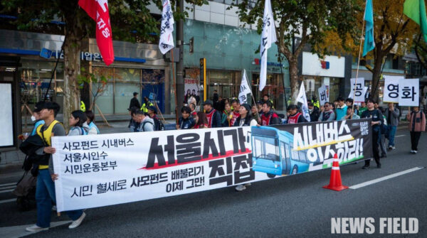 ‘사모펀드 시내버스 서울시 인수 시민운동본부’는 지난 15일 토요일 오후 2시 서울시청 동편 거리에서 버스 공영화를 요구하는 ‘공공BUS KING!’ 시민 행진을 개최했다. 운동본부는 시민의 세금으로 지원되는 공공교통인 시내버스 일부 노선이 사모펀드에 의해 운영되는 현실을 지적하며, 서울시가 이를 직접 인수해 공공성을 회복해야 한다는 요구를 담았다. 운동본부는 올해 9월 출범한 뒤 사모펀드 운영 노선의 공영화를 촉구하는 시민 서명운동과 서울 시내 주요 거점 선전전 등을 꾸준히 이어오고 있다.