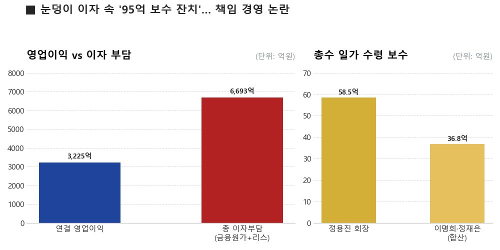 ■ 신용도는 ‘AA-’ 추락, 이자 부담은 6,693억… 총수 일가는 ‘95억 보수 잔치’
