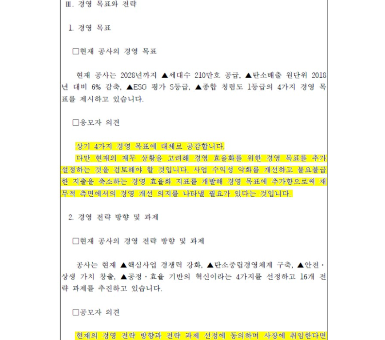 이어 3페이지 정용기 전 의원이 제시한 <경영 목표와 전략>란에도 현재 공사의 경영목표에 나열에 이어 ‘효율화 지표 개발’이라는 단어가 다시 한번 추가됐다. 그리고 <경영 전략 방향 및 과제>에는 ‘최선을 다하겠다’는 포부만 추가되는 등 계속해서 현황으로만 직무수행계획서를 채우기에 급급했다.