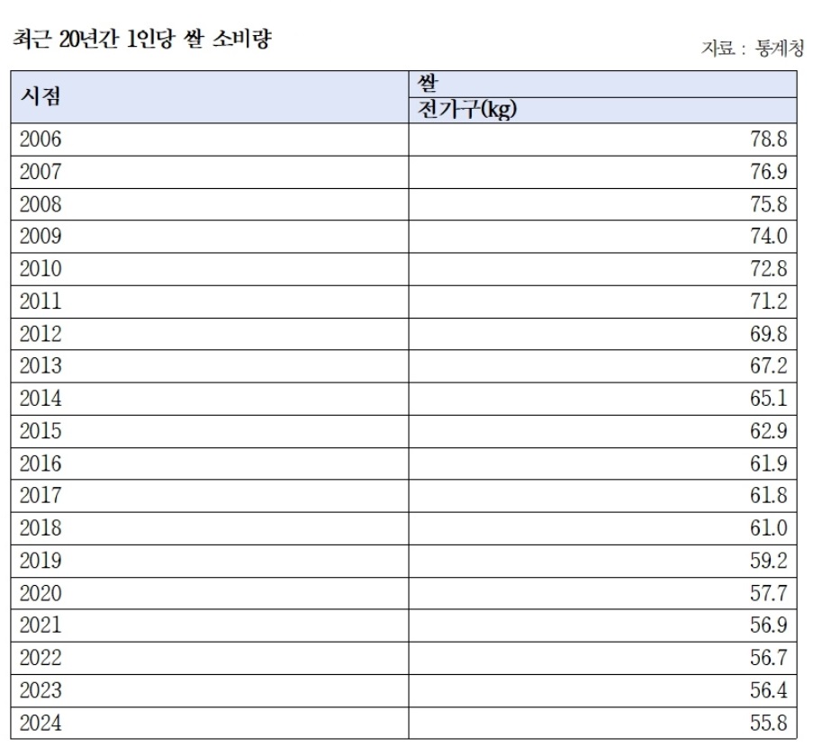 또한 2006년 78.8kg이었던 국민 1인당 쌀 소비량이 2024년 55.8kg으로 23kg이나 줄었다고 통계청 자료를 통해 밝혔다.