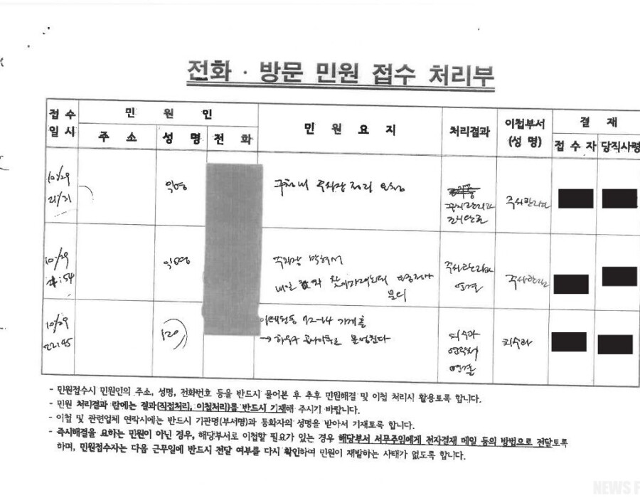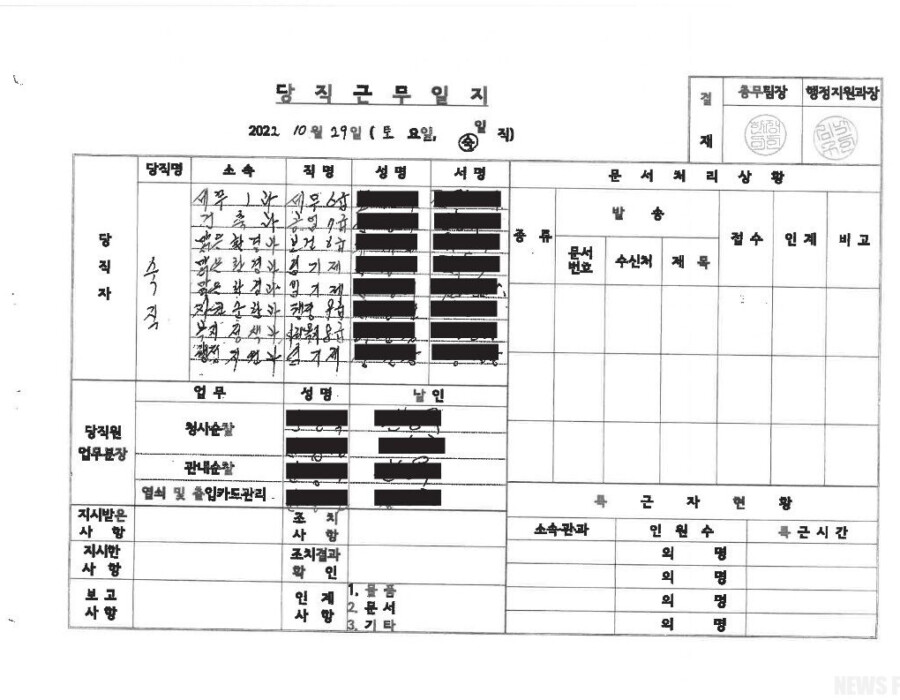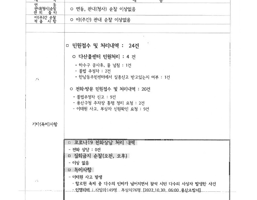 ― 용산구청 당직실, 이태원 참사 관련 내용은 간단 언급뿐… ▲상황실 연락 ▲비상연락망 가동 ▲관내순찰 이상 전혀 없고 실종자 문의 민원엔 ‘알 수 없다’고 응대