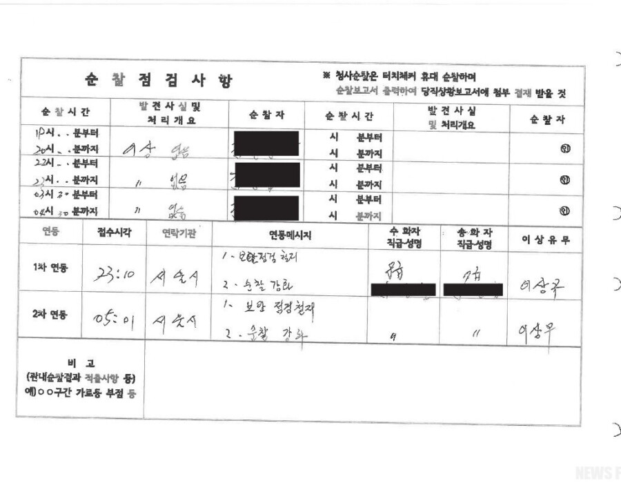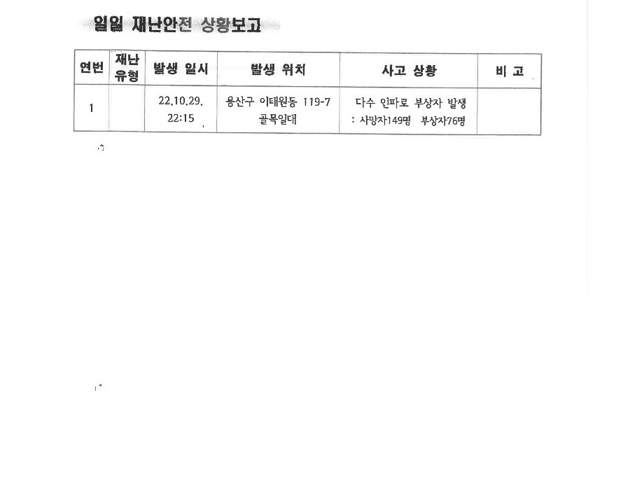 또한, 용산구청 당직일지에 첨부된 ‘안전관리 일일 상황보고’에 따르면 용산구청 종합상황실로 소개된 전화번호는 두 개로 이는 각각 안전재난과, 당직실 번호였다.