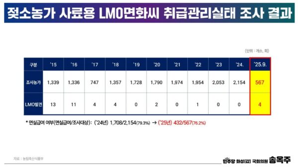 또한, 종자용·사료용 면실 외에 목화 솜과 씨앗이 섞인 실면이 지난해부터 올 9월까지 브라질 등지에서 수입된 점을 지적하며, 이 실면이 국내산으로 둔갑해 전자상거래 되는 것은 아닌지에 대한 확인도 필요하다고 덧붙였다. 농식품부는 미승인 LMO의 환경 방출에 능동적으로 대응하기 위해 LMO법 개정을 추진 중이며, 미승인 LMO 폐기·반송 의무자에 수입·판매자를 추가하고 소유자 불분명 등 긴급한 경우 즉시 폐기 사유를 추가할 계획이라고 밝혔다. 송 의원은 LMO 검출과 대응 조치는 “국민이 알아야 할 민감 정보인 만큼 투명하게 공개해야 한다”고 강조했다.